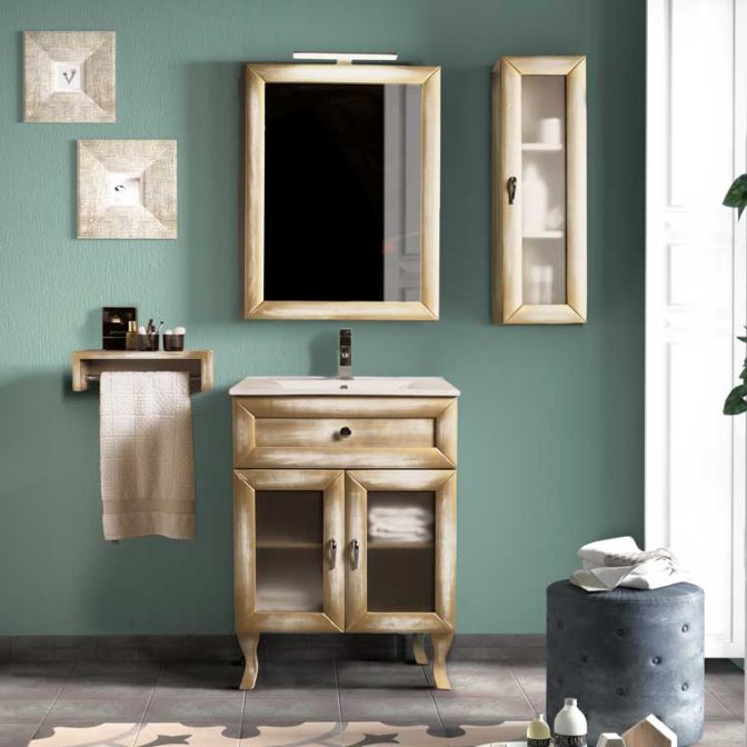 Los Muebles de Baño de la Serie Alessia están fabricados en madera de pino Radiata, libre de nudos y vaporizado entre 8º y 12º, para evitar movimientos en la madera. El acabado se realiza con varias capas de fondo con barniz de poliuretano y acrílicos, terminado con barniz de poliuretano y acrílicos con alta resistencia a la luz, temperatura y humedad y se aplica tanto al exterior como al interior y trasera. El cristal es de alta calidad, los herrajes que trabajamos son de primeras marcas, ejemplo Hettich, y los apliques de luz de Led y anticorrosivos.