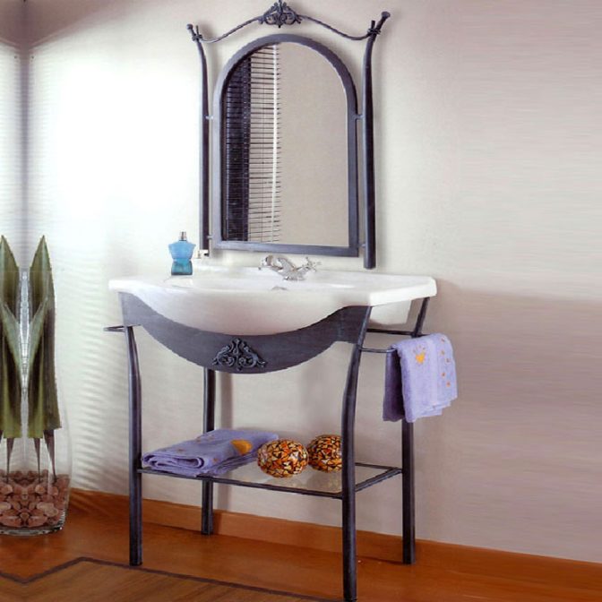 Los Muebles de Baño Forja de la Serie Coni están fabricados en Forja de alta calidad. El acabado se realiza con varias capas de barniz de poliuretano y acrílicos, terminado con barniz de poliuretano y acrílicos con alta resistencia a la luz, temperatura y humedad. El cristal es de alta calidad.
