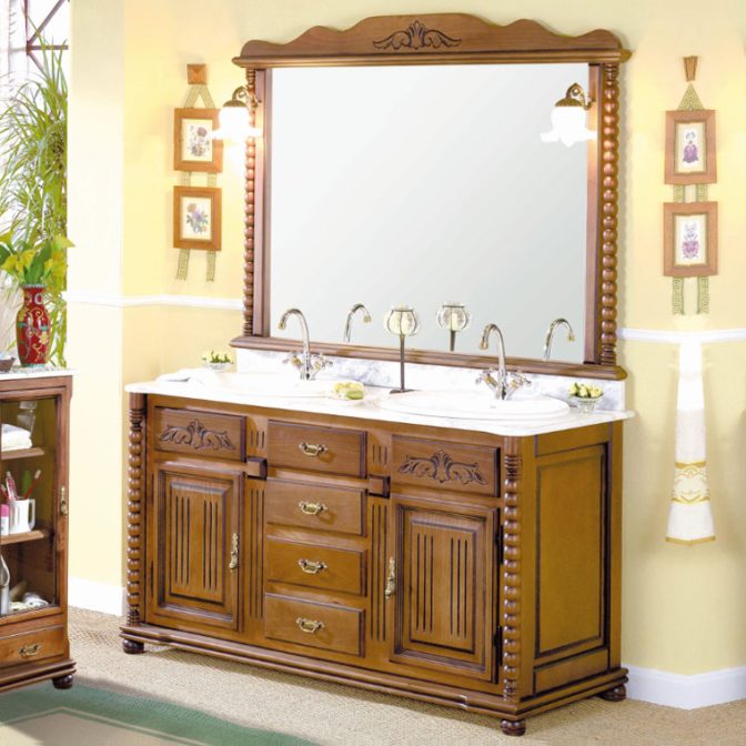 Los Muebles de Baño de la Serie Olimpo están fabricados en madera de pino Radiata, libre de nudos y vaporizado entre 8º y 12º, para evitar movimientos en la madera. El acabado se realiza con varias capas de fondo con barniz de poliuretano y acrílicos, terminado con barniz de poliuretano y acrílicos con alta resistencia a la luz, temperatura y humedad. El cristal es de alta calidad y los herrajes y apliques de luz, anticorrosivos.